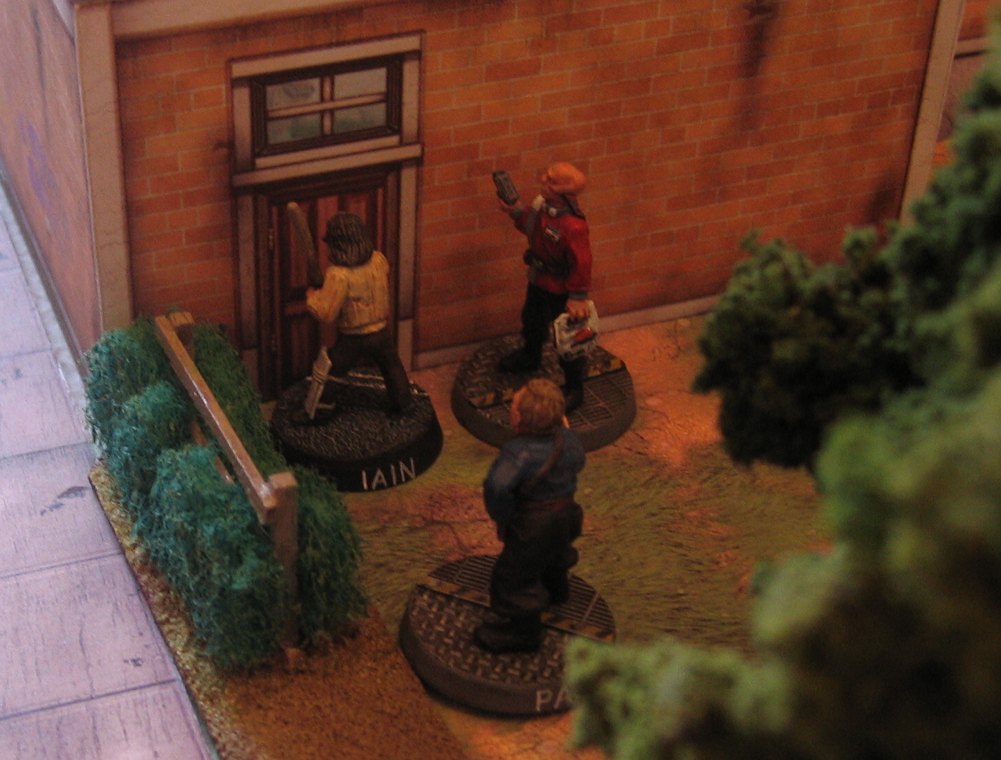 The mob caught up with Iain at the corner of the Motor Repair Shop. For a moment it looked as if he wouldn't make it, but he smashed the skull of the first attacker and knocked down the second zombie. Iain then broke free from the third creature to clutch at him and continued to flee. Thank goodness he'd kept the cricket bat from his school days!