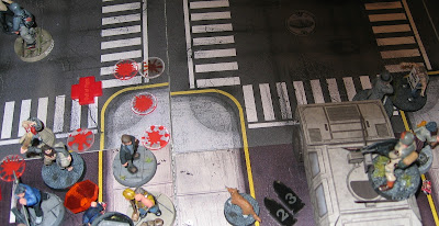 The mob immediately broke ranks and charged. Lieutenant Costner squeezed off a single pistol shot as the thugs approached, but his bullet went wide (perhaps it was also intended as a warning). Connery reacted by instinct, mowing down 3 of the protestors with his assault rifle. Any hope of a peaceful settlement was now gone (to be fair, a REP 4 angry mob with 3 agitators was always likely to make a swift frontal attack, if I've understood the ATZ:Haven rules for mobs correctly)!